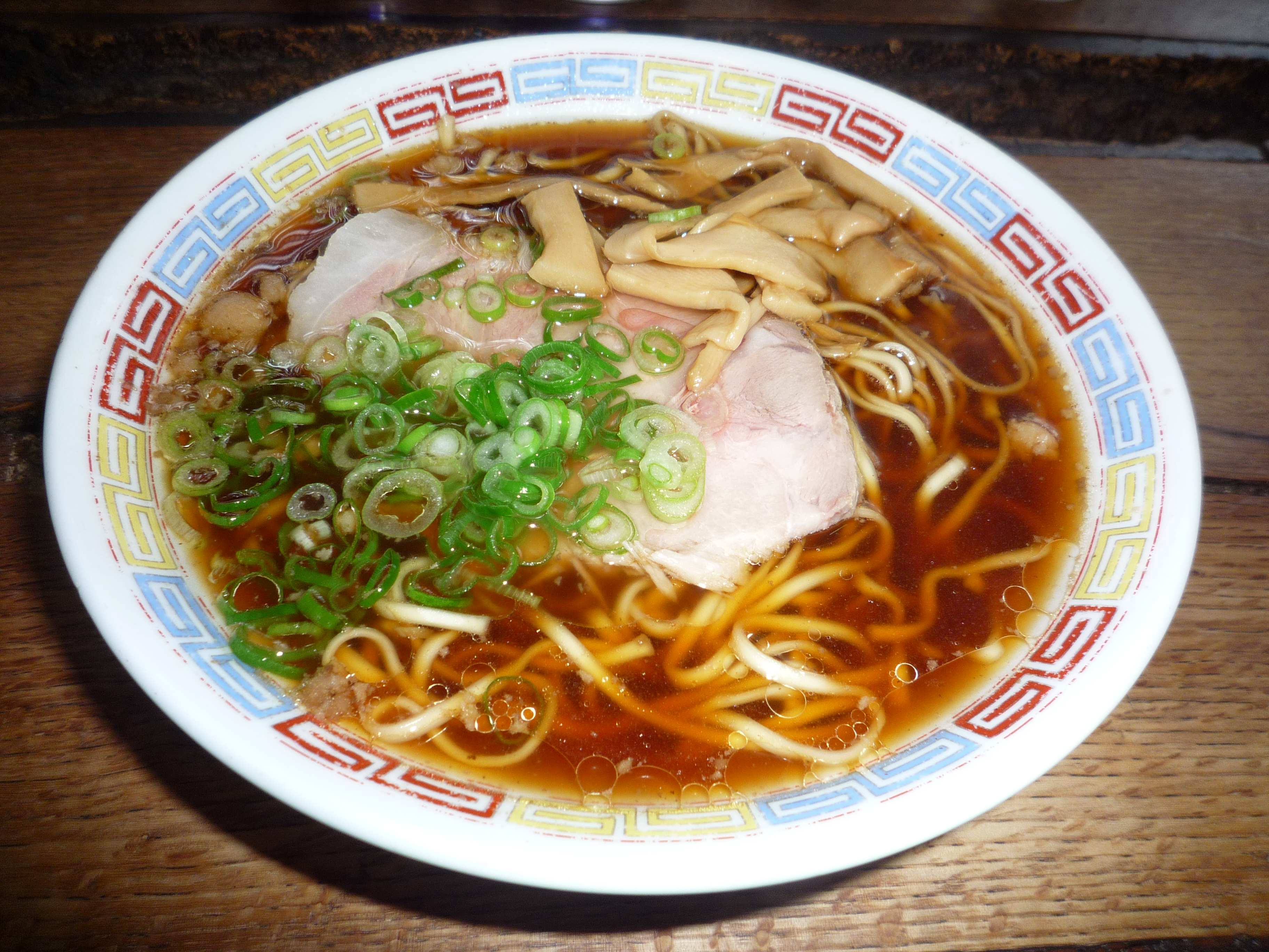 | The dark coloured soy sauce seafood base soup with roasted pork fat. Flat medium fat noodles and roasted pork for the topping. | ||